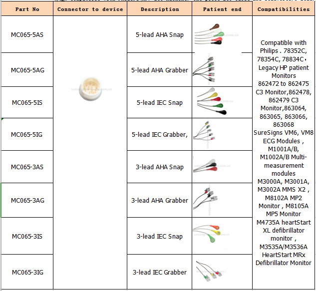 "Kompatibel med Philips. 78352C, 78354C, 78834C , Ældre HP-patientmonitorer 862472 til 862475 C3 Monitor, 862478, 862479 C3 Monitor, 863064, 863065, 863066, 863068 SureSigns VM6, VM8 ECG Modules, M1001A / B, M1002A / B Multi- målemoduler M3000A, M3001A, M3002A MMS X2, M8102A MP2 Monitor, M8105A MP5 Monitor M4735A heartStart XL defibrillator monitor, M3535A / M3536A HeartStart MRx Defibrillator Monitor "