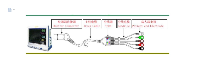 Ansøg om multiparameter monitor / elektrokardiogram maskine / træner løbebånd eller defibrillator, transporter biokraftsignalet fra menneskekroppen. Patientkablerne og elektrodeledningerne bruges til at forbinde elektroder, katetre og / eller sensorer, der er placeret på passende steder på patienten, til en overvågningsindretning til generel overvågning og / eller diagnostisk evaluering af en sundhedsmedarbejder