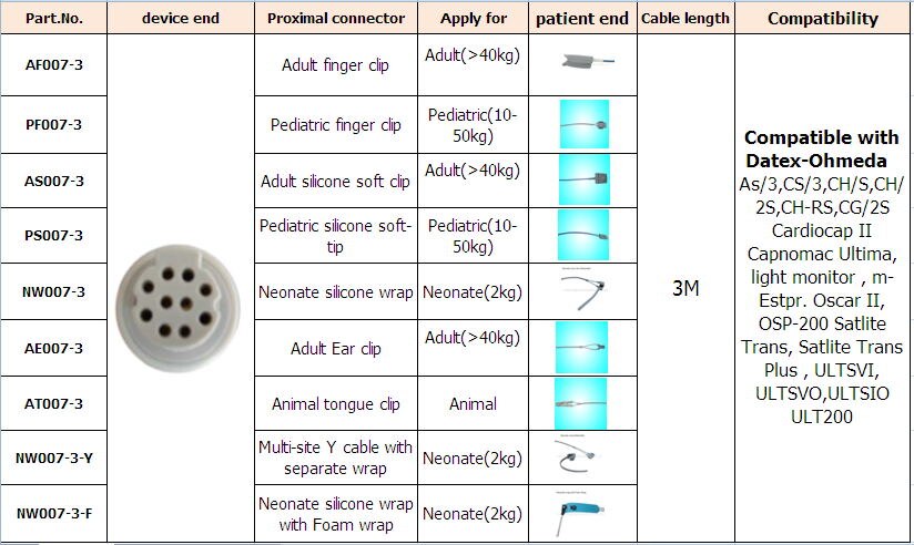 AF007-3 Kompatibel med Datex-Ohmeda As / 3, CS / 3, CH / S, CH / 2S, CH-RS, CG / 2S Cardiocap II Capnomac Ultima, lys monitor, m-Estpr. Oscar II, OSP-200 Satlite Trans, Satlite Trans Plus, ULTSVI, ULTSVO, ULTSIO ULT200